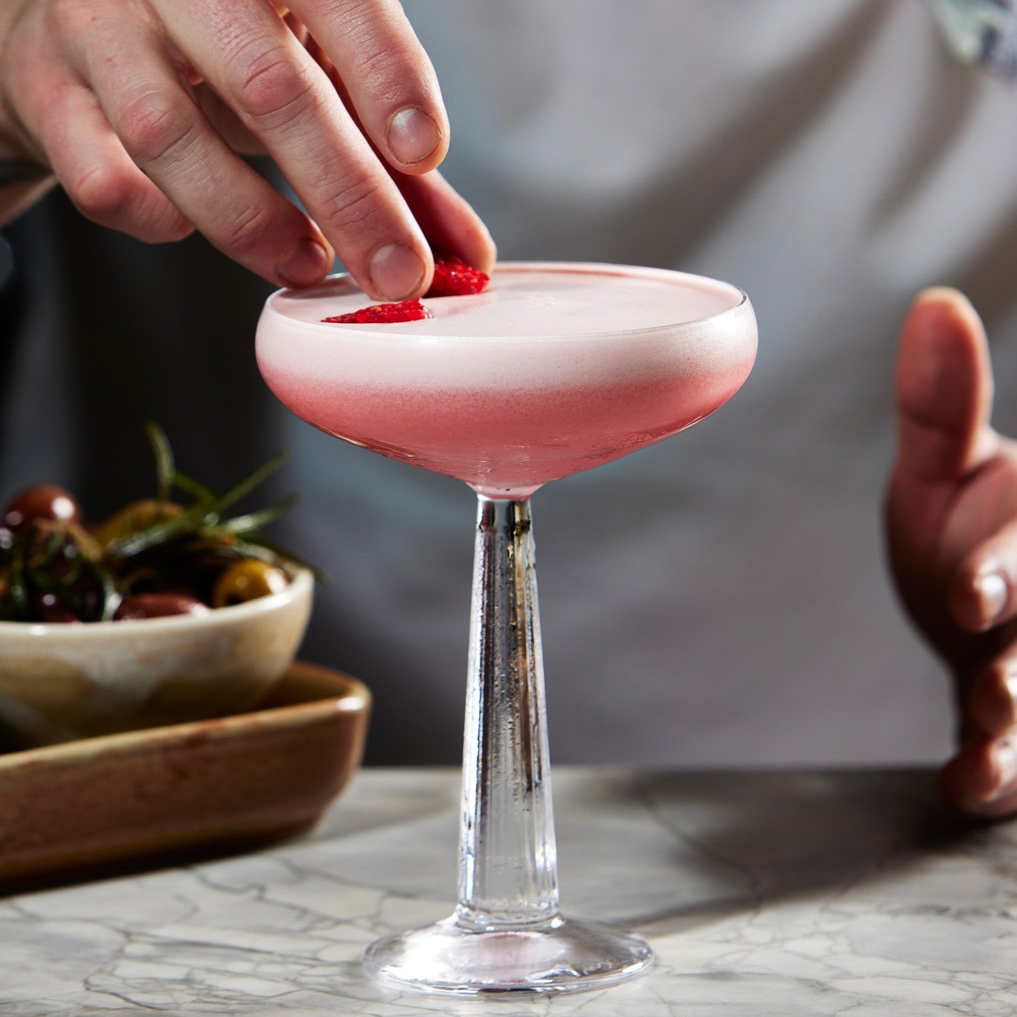Add ice, gin, Chambord, raspberry syrup and aquafab aquafaba to a shaker.
