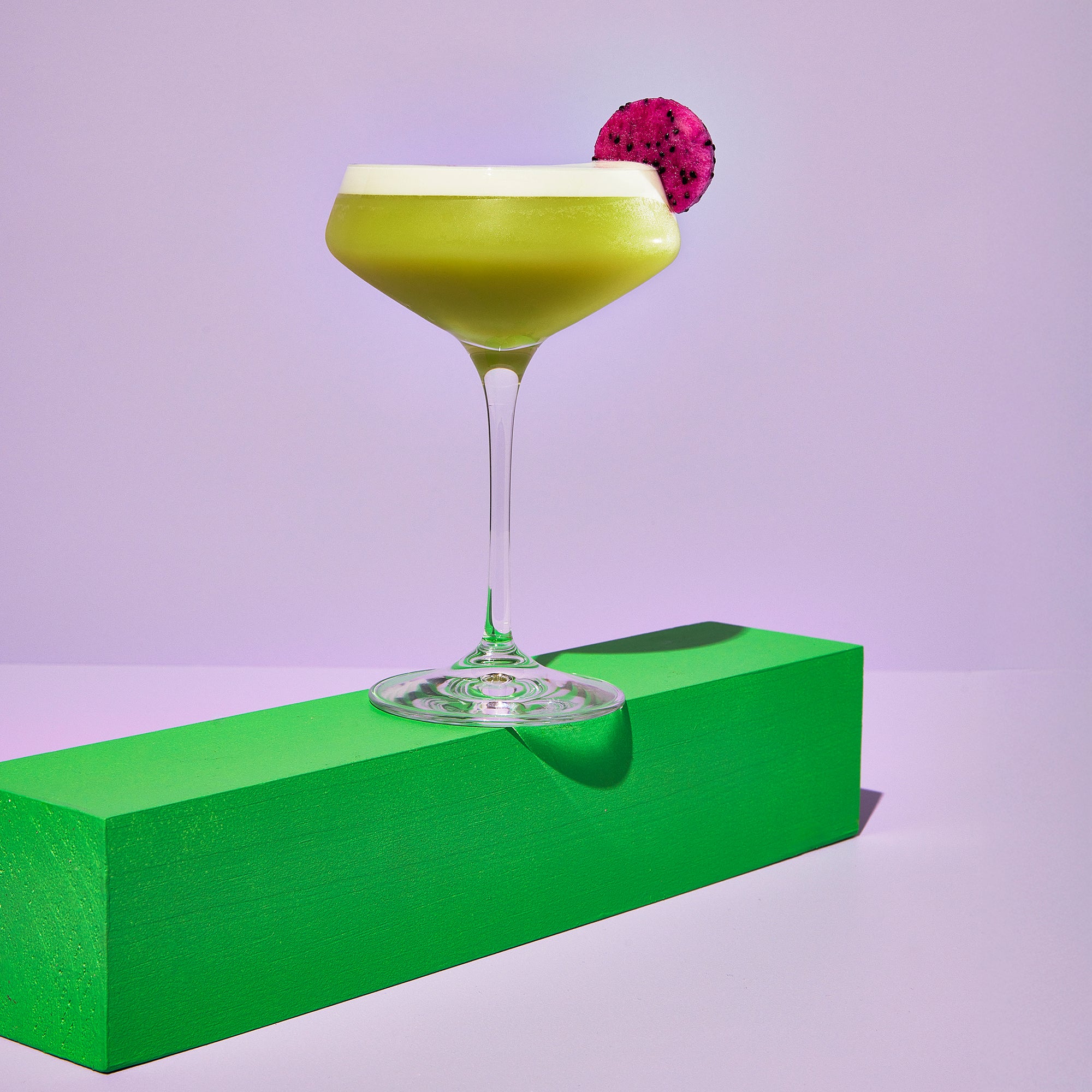 Add ice, midori, lemon juice sugar syrup and aquafab aquafaba to a shaker.